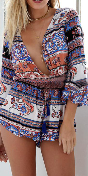 Sexy Deep V-neck Long Sleeve Gathered Waist Printed Rompers