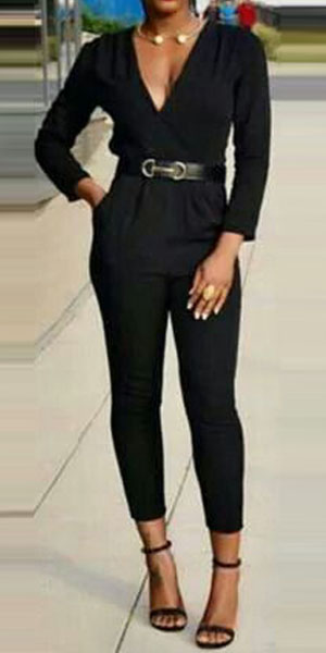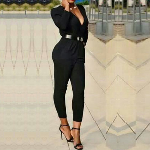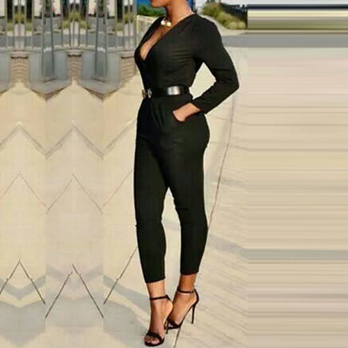 This long sleeve jumpsuit features mysterious and flattering black color,with a deep v-neck,high waist