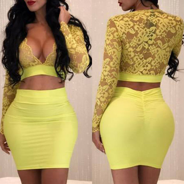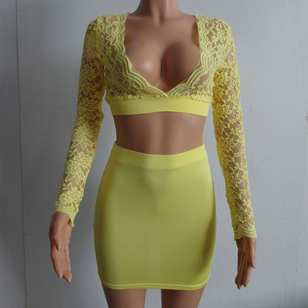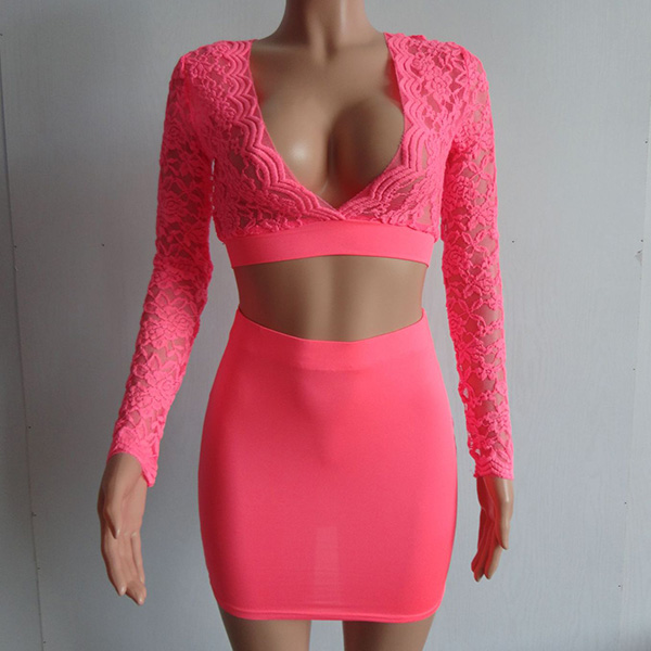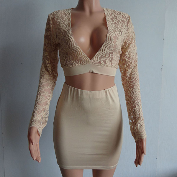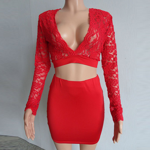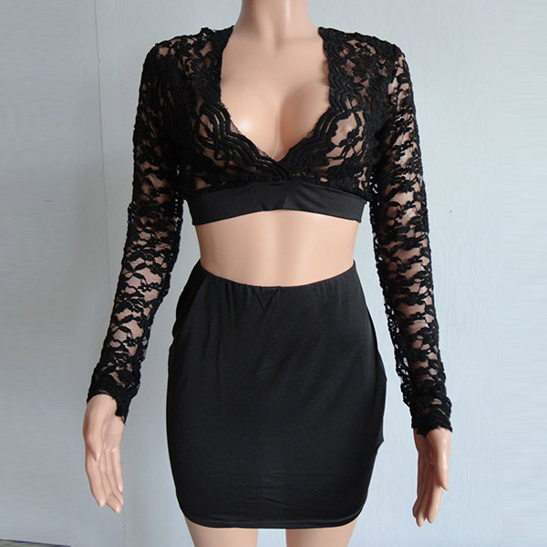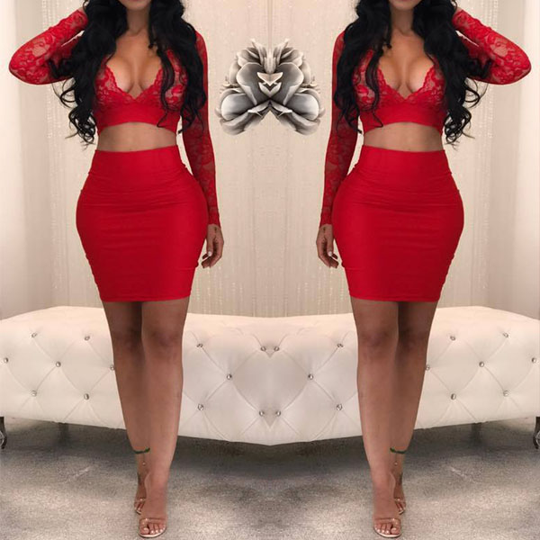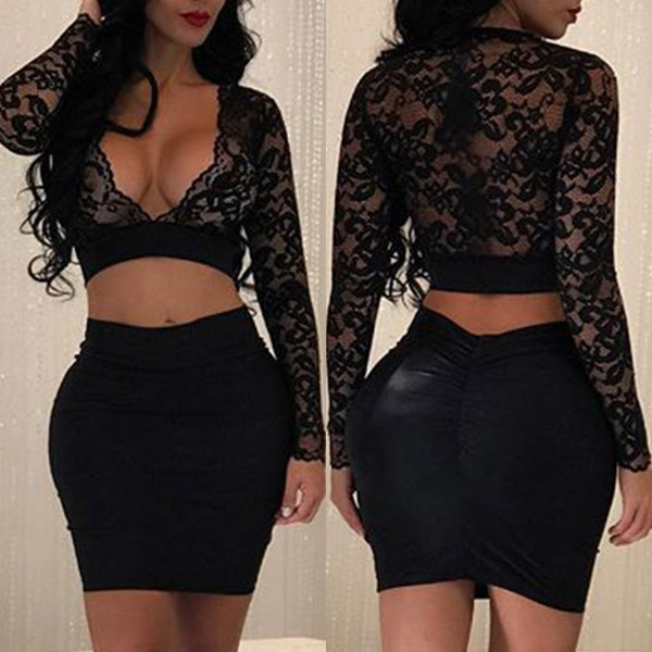 Including a long sleeve deep v-neck lace crop top and a high waist skirt,this two-piece set definitely can showcase