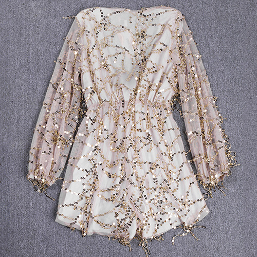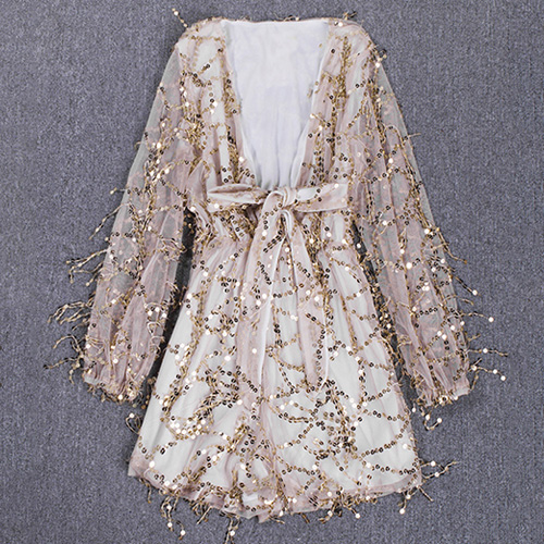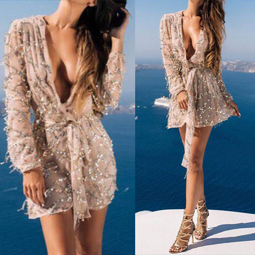 If invited to a party,this dress is bound to make you stand out. Outfitted with long sleeve,a deep v-neckline