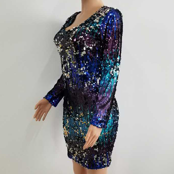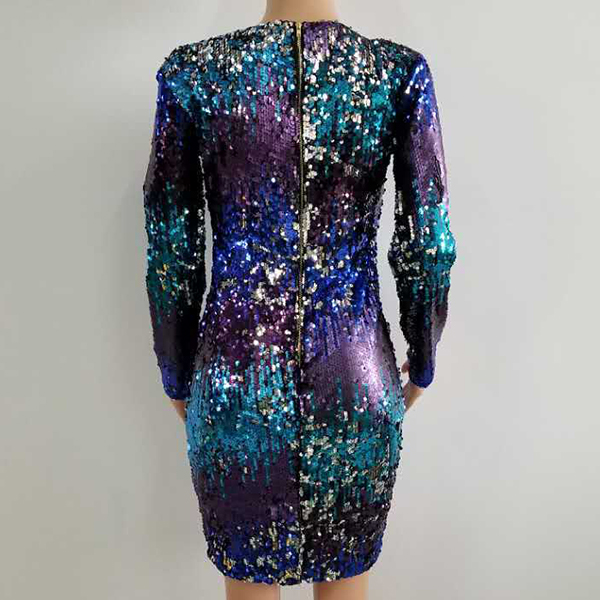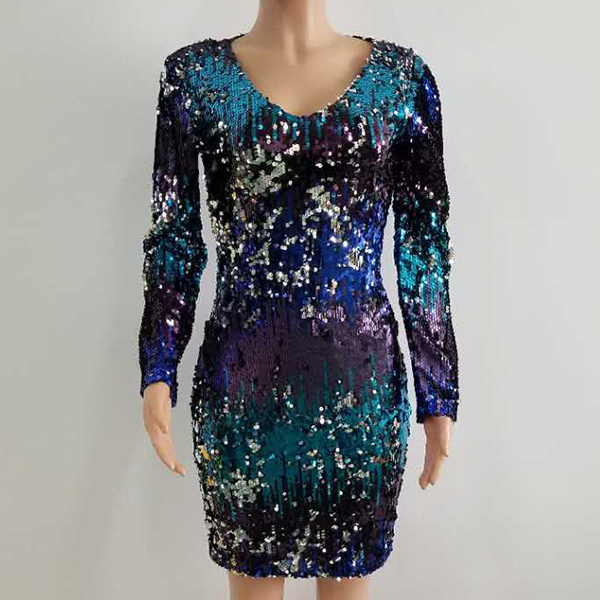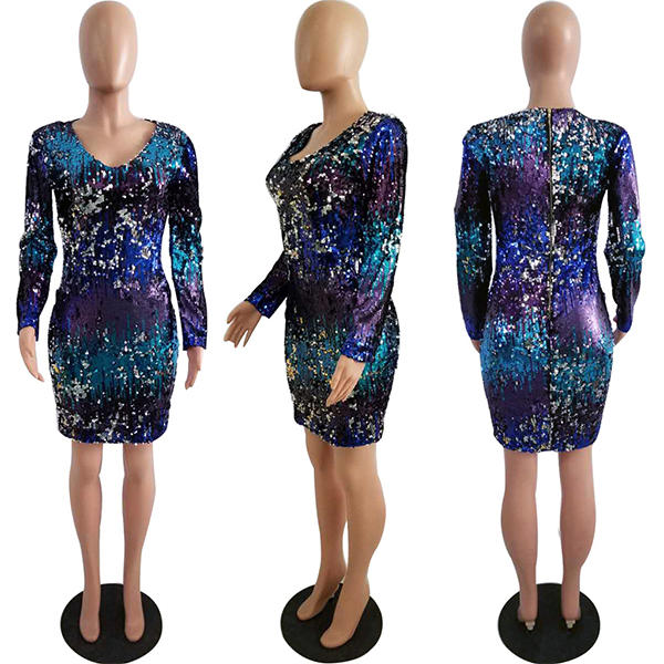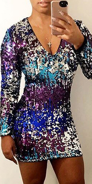 Sexy Deep V-neck Long Sleeve Slim Fit Sequin Party Dress