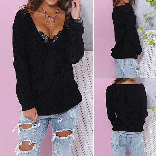Sexy Deep V-neck Long Sleeve Solid Color Knit Sweater