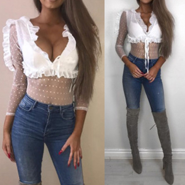 like deep v-neck,see-through gauze spliced and ruffle design make this piece look so alluring.