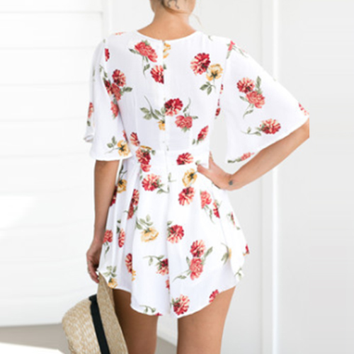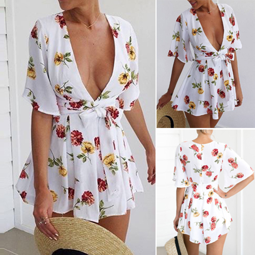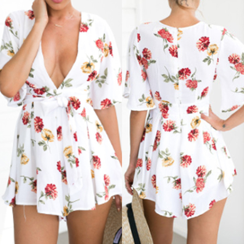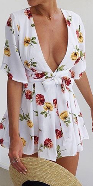 Summer style looks a lot like this short sleeve romper! Boasting a vibrant floral print and a deep v-neckline,