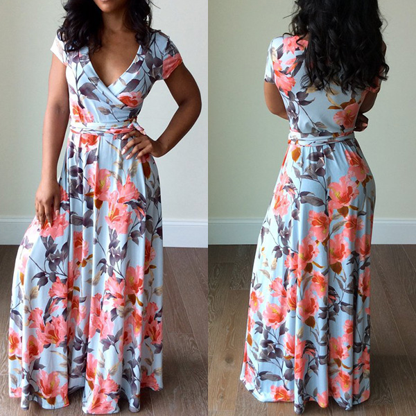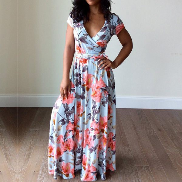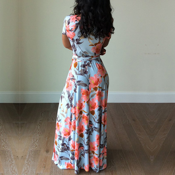 Boasts chic and eye-catching printed pattern,designed with short sleeve,deep v-neck,high waist and a maxi length,