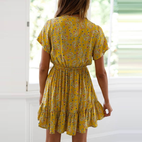 Boasts vibrant floral print,this short sleeve dress can give you an eye-catching look,while the deep v-neck