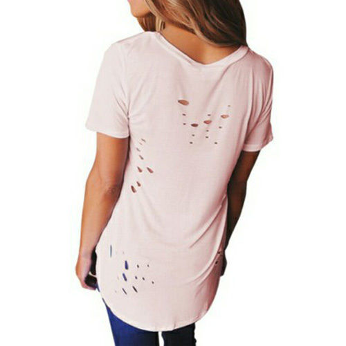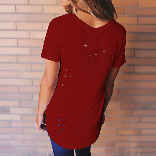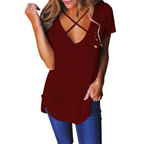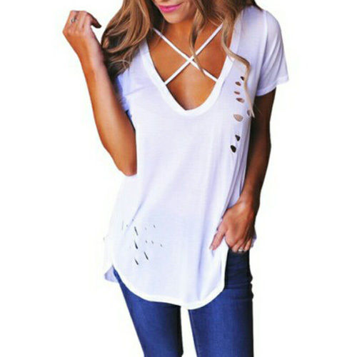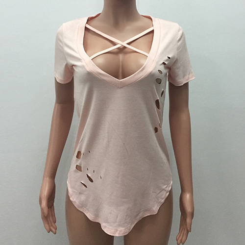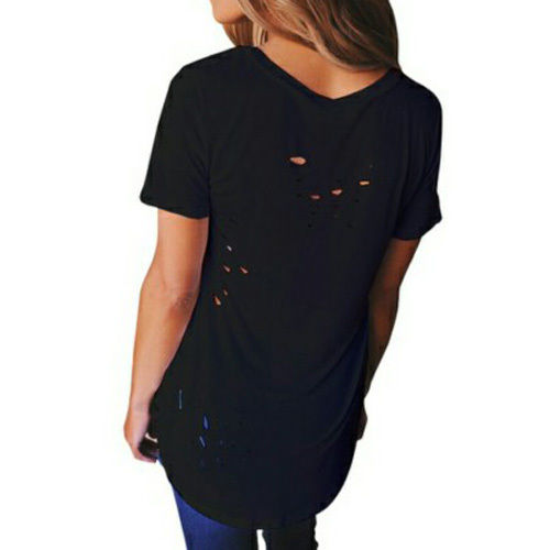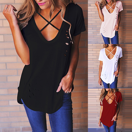 Easy to achieve a chic yet sexy style with this t-shirt. Solid color style,its deep v-neckline and ripped details