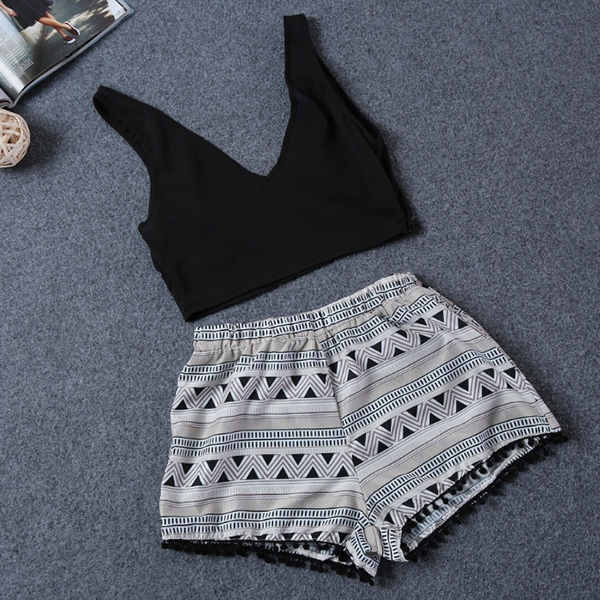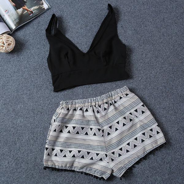 deep v-neck crop top and a printed shorts,this two-piece set can help showcase your seductive curve and charming style.