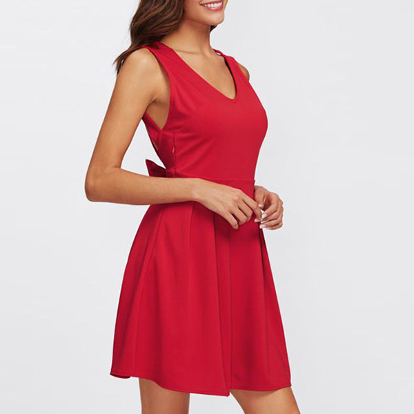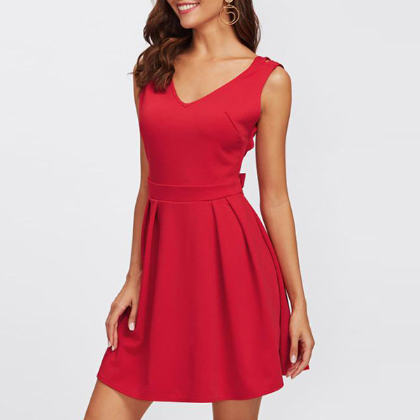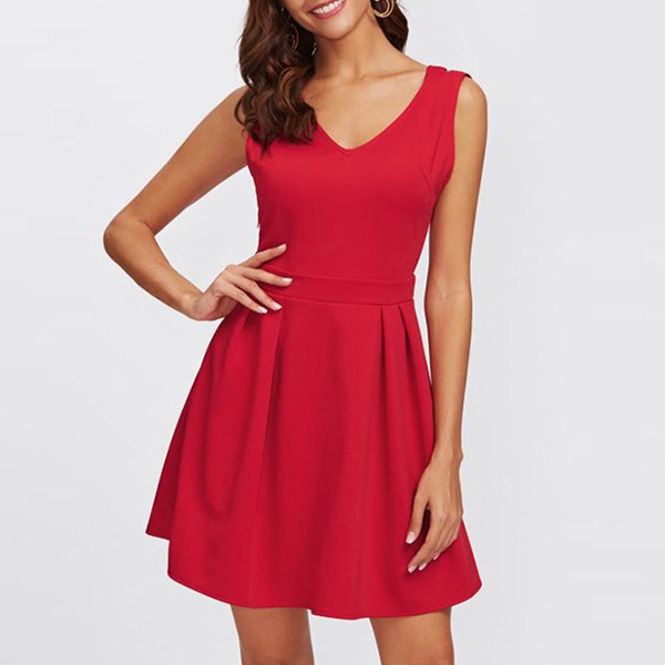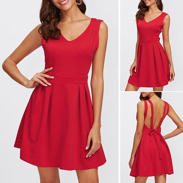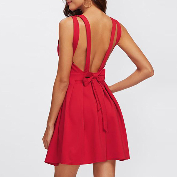 Sexy Deep V-neck Sleeveless Solid Color Backless Ruffle Hemline Dress