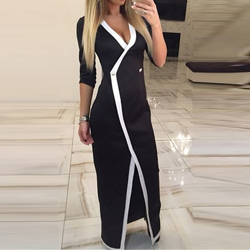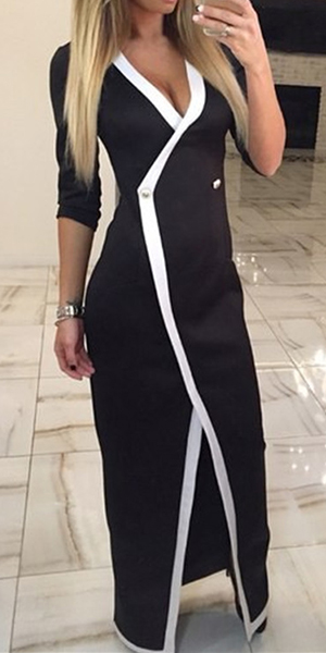 This maxi dress features contrast color style,outfitted with 3/4 sleeve and a maxi length,