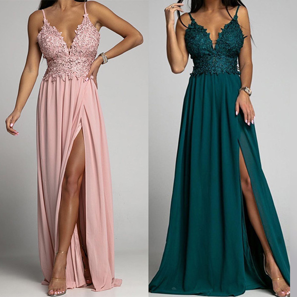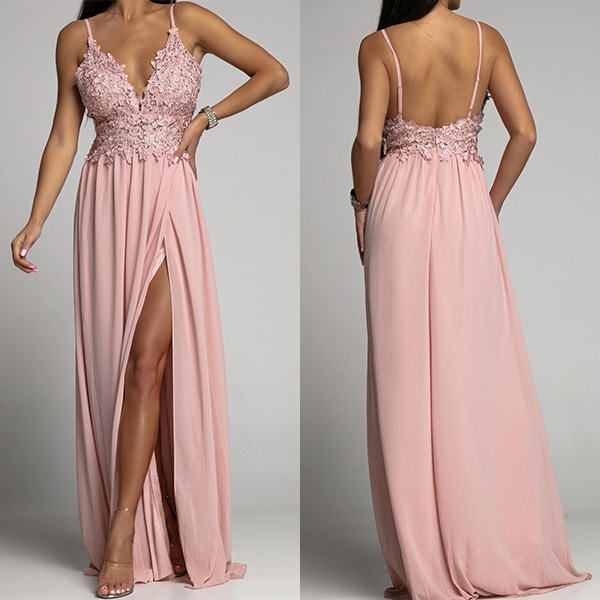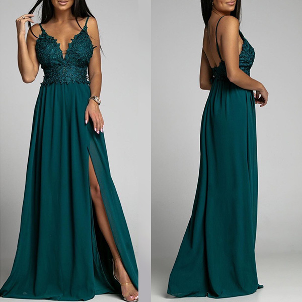 Sexy Deep V-neck Slit Hem Lace Spliced Floor-length Evening Dress
