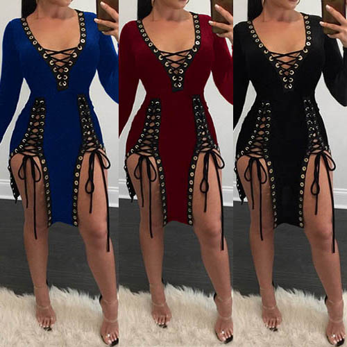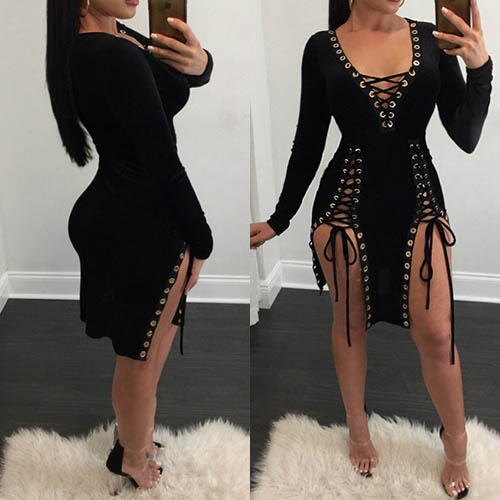 v-neckline,slit hem,hollow out and lace-up design make this dress look so seductive. Once wear it,I promise all eyes would be focused on you.