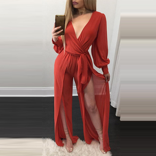 You will be surprised what this alluring jumpsuit can do for you! Solid color style,styled with lantern sleeve,deep