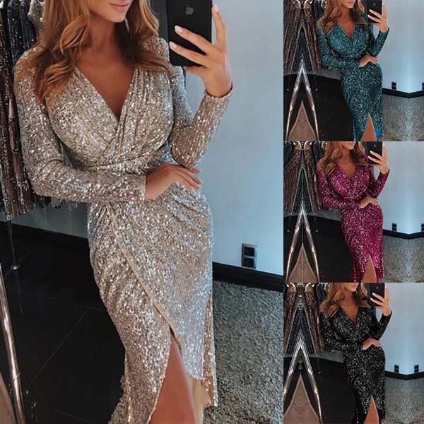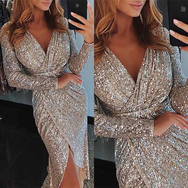 Sequin design makes it look so eye-catching and charming,while the deep v-neck and slit hem design