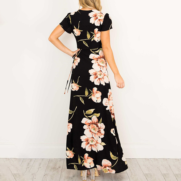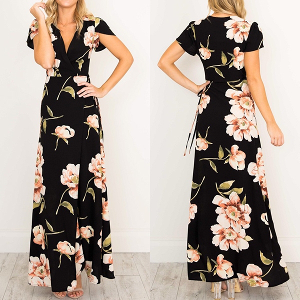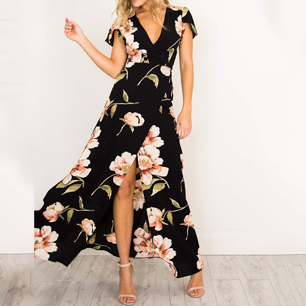 more attention. Its vibrant floral print design for a sweet and romantic vibe,while the deep v-neck and slit hem design