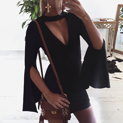 v-neckline,trumpet sleeve with slit details,and fit silhouette make this dress look so sexy