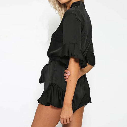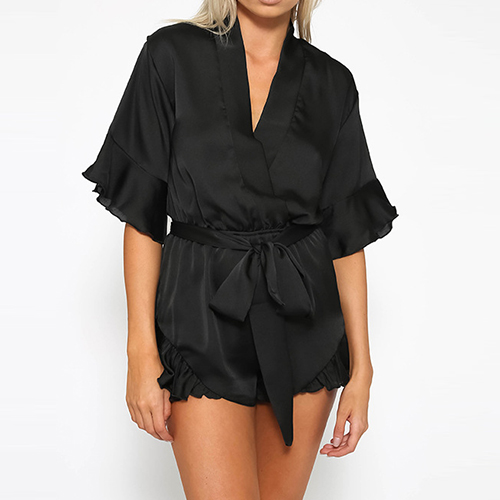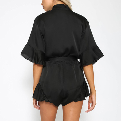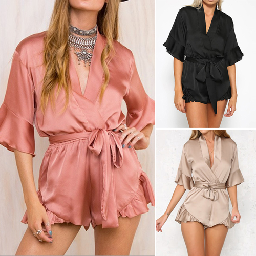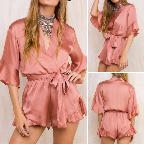 Slip into this romper for that edgy chic appeal. Solid color style,its deep v-neckline and flouncing