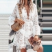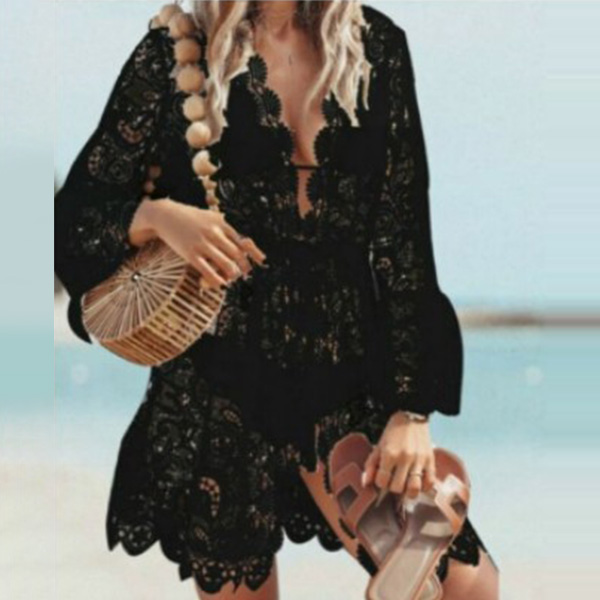 Sexy Deep V-neck Solid Color Long Sleeve Embroidered Lace Dress