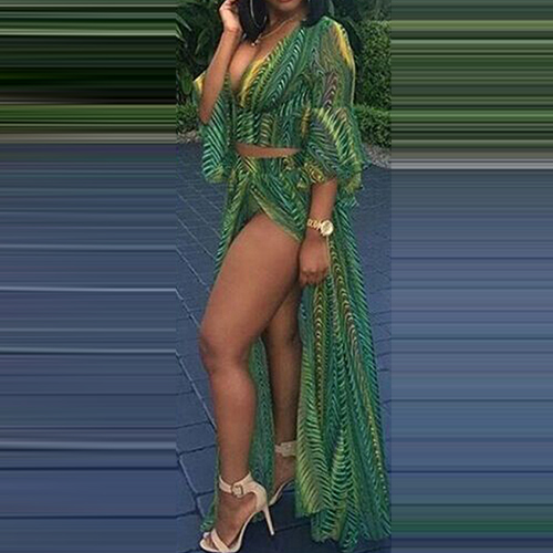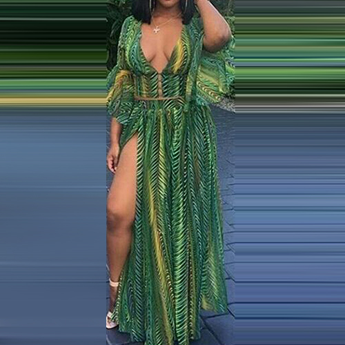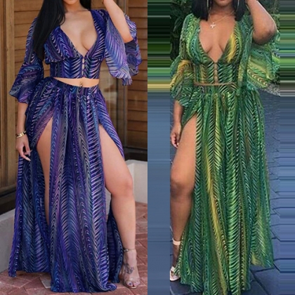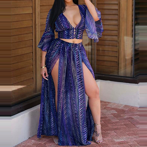 deep v-neck trumpet sleeve crop top and a high waist slit hem maxi skirt,this two-piece set is a good way to