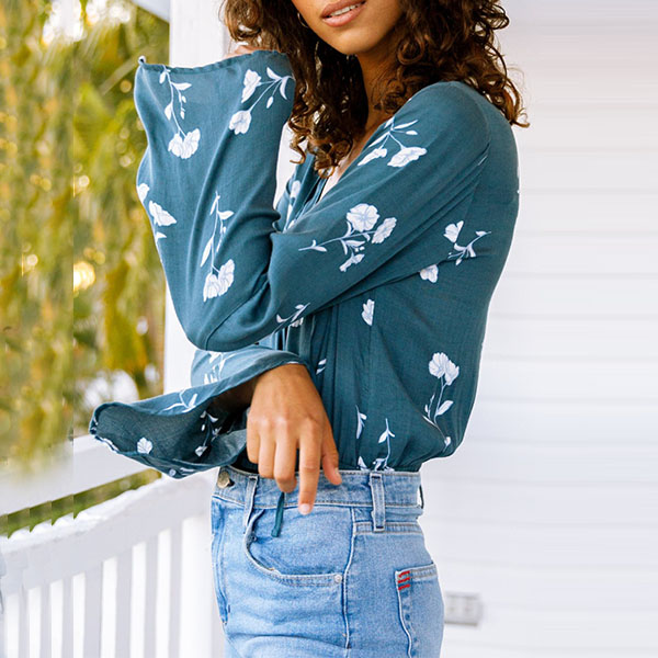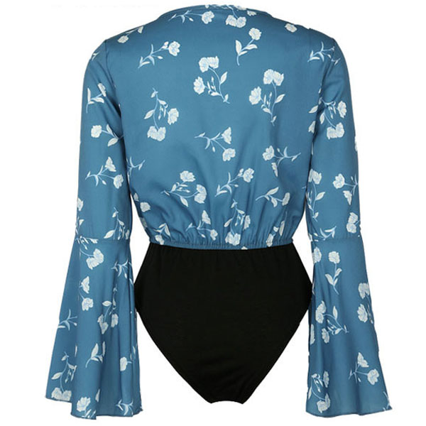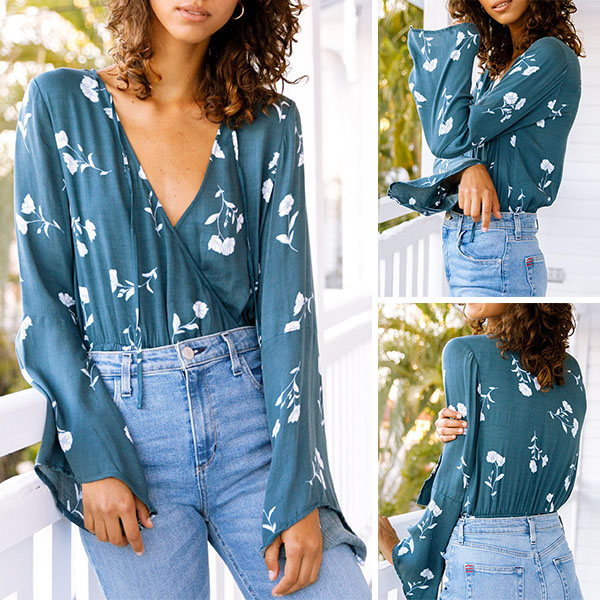 vibrant floral print,accompanied with deep v-neck and trumpet sleeve,this little piece can give you a sweet and