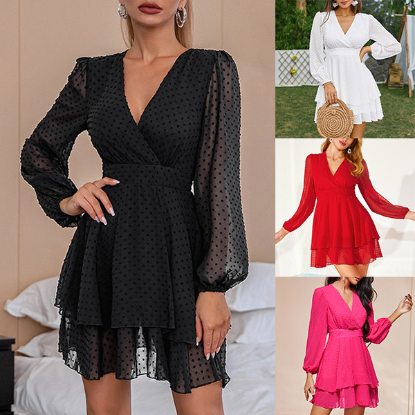 Sexy Deep V-neck Trumpet Sleeve Ruffle Hem Dots Printed Dress