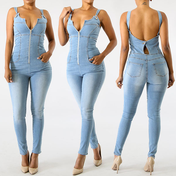 Up your denim game girl with these seriously on point slim leg sleeveless jumpsuit! Featuring a high waisted fit with a zipper front design, button closure back and pocket detail, style this with your strappy heels to complete the look.