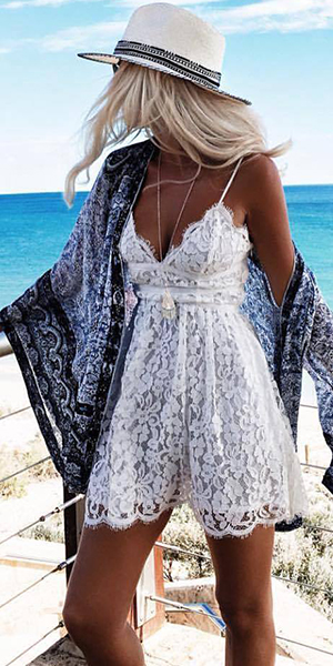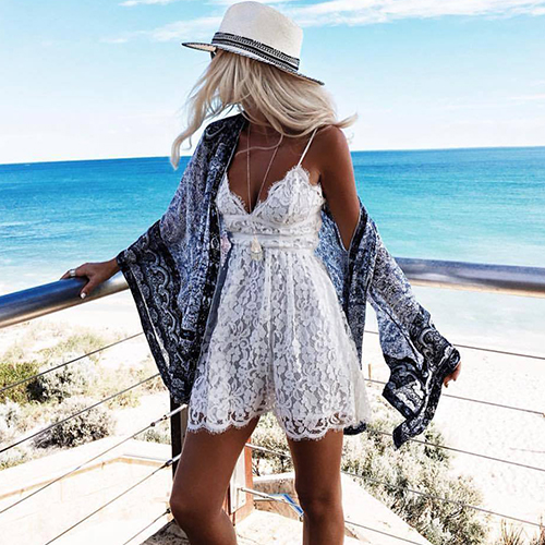 Lace romper is always called women's beauty secret. Outfitted with eyelash lace, deep v-neck and sleeveless design,