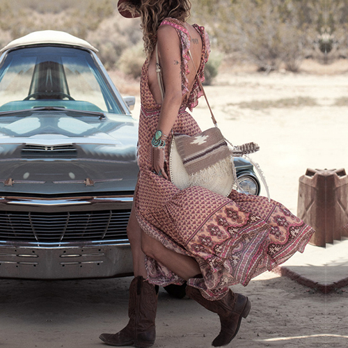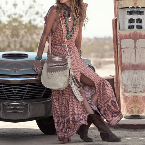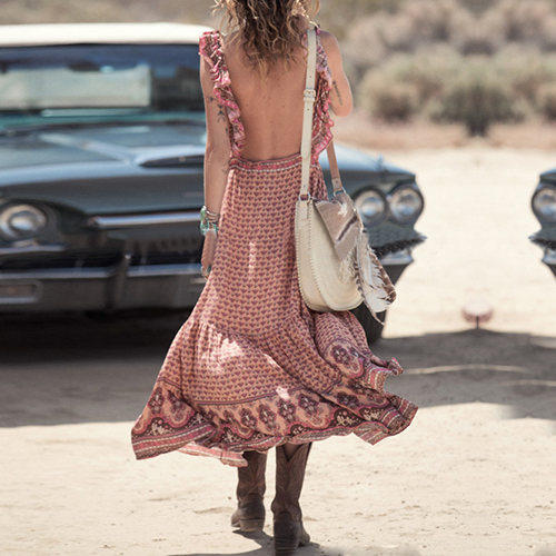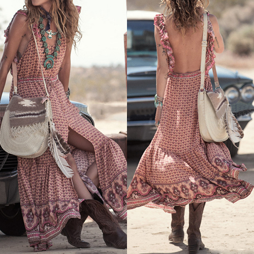 is the perfect choice. Boasting a vibrant floral print,its flouncing backless and slit hem design makes it look more
