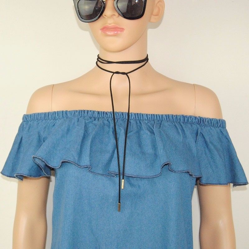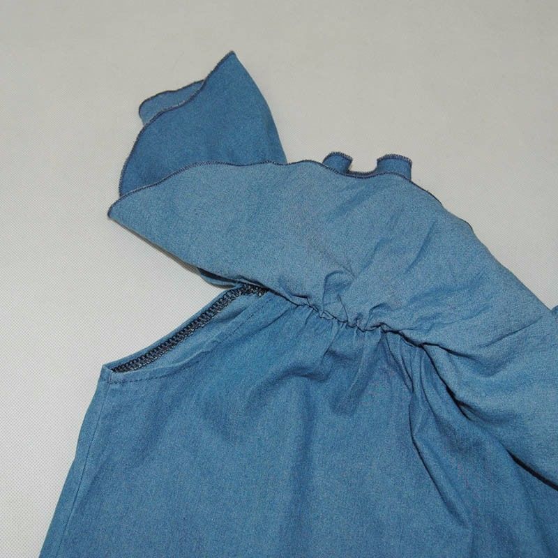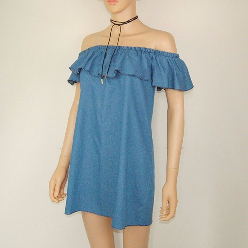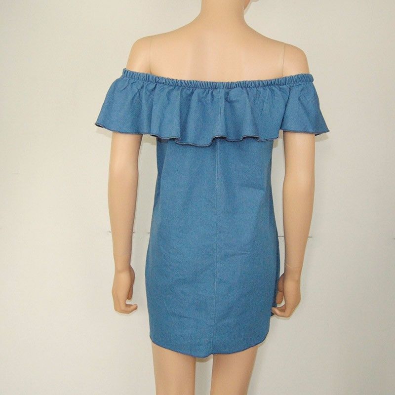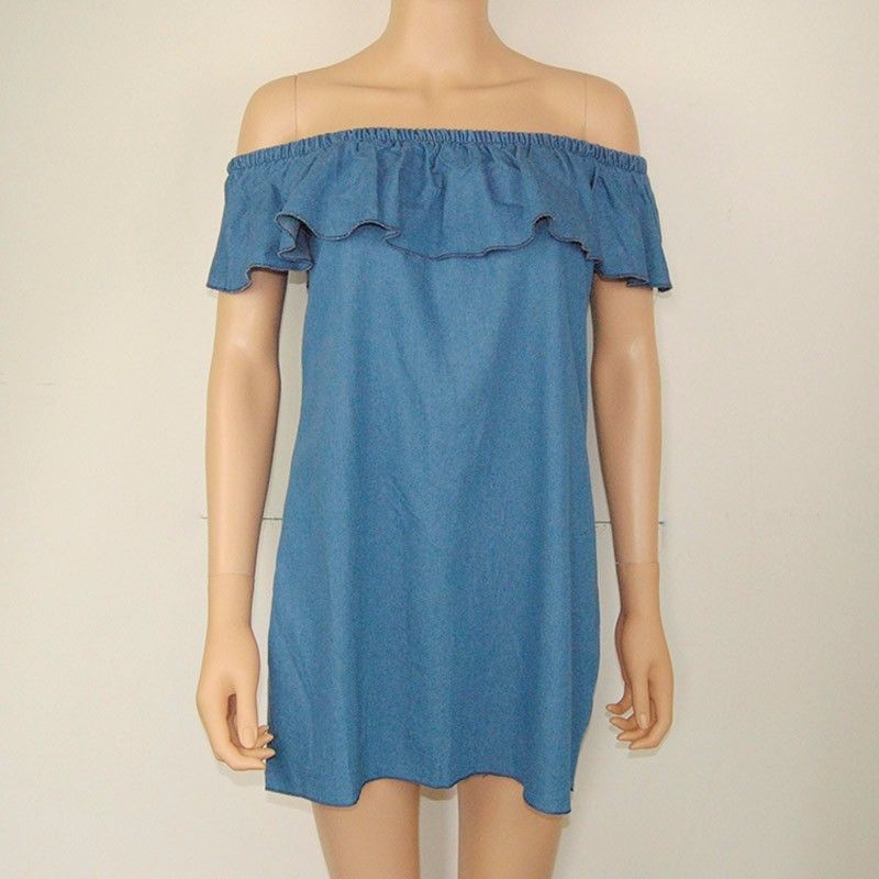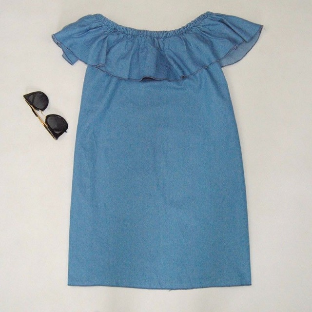 Easy to achieve a charming look with this denim dress. Its slash neck with flouncing design
