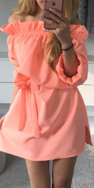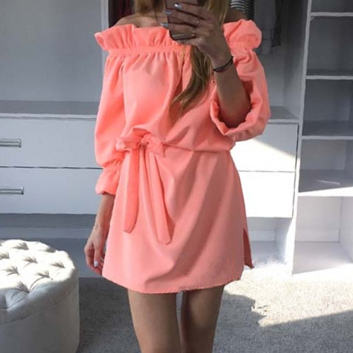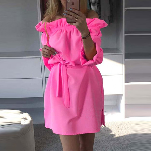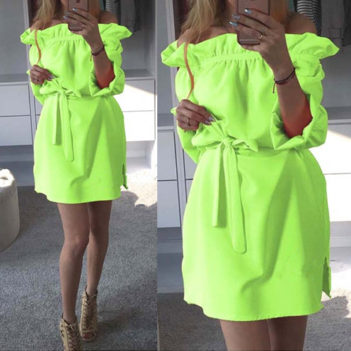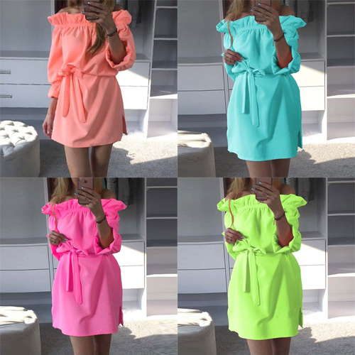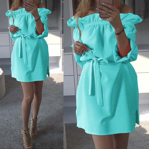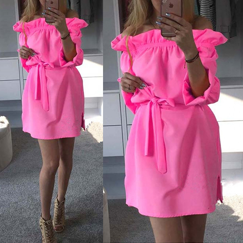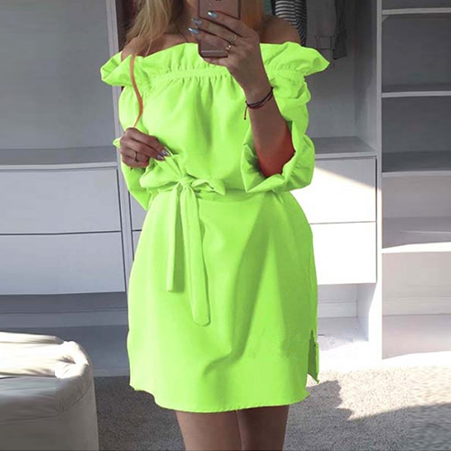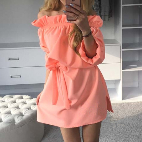 slip into this breathtaking dress. Solid color style,its slash neck with flouncing design makes
