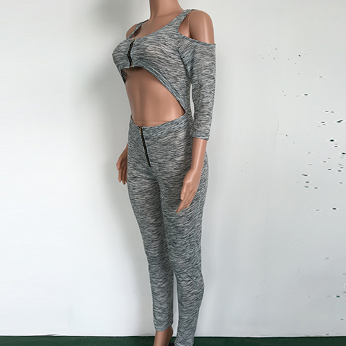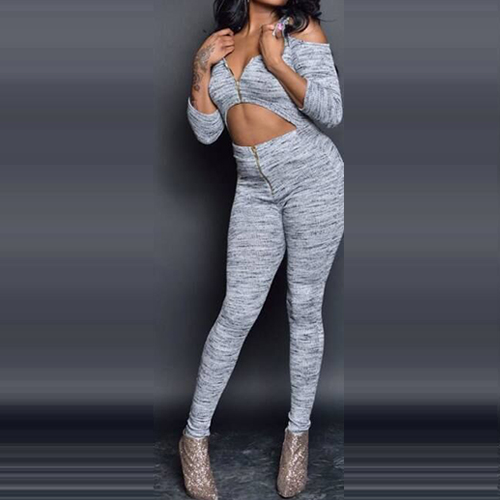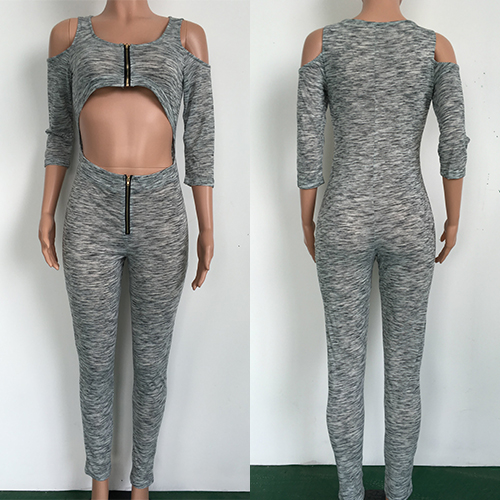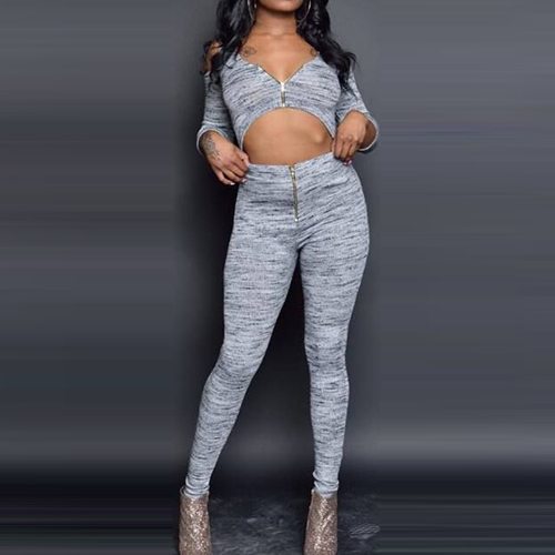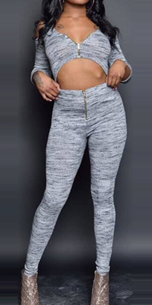 pressure with this sexy two-piece set! Including a crop tops with front zipper, cold shoulder and 3/4 sleeve design,