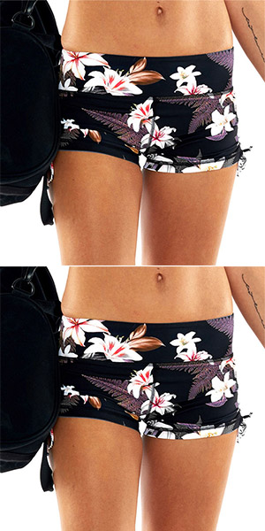 super shorts in dark color polyster with flowers printed pattern.Elastic band in the shorts can