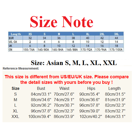 XXL : Bust : 100cm(39.37"); Waist : 86cm(33.86"); Hips : 102cm(40.16"); Length : 84cm(33.07");