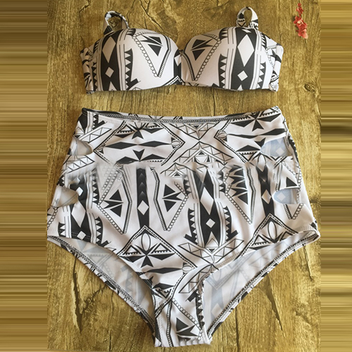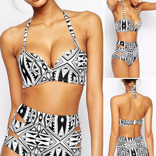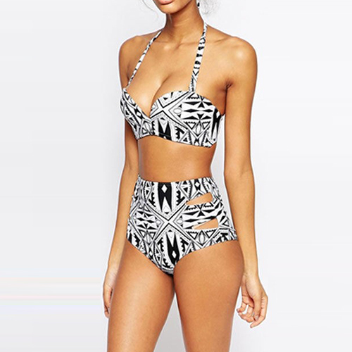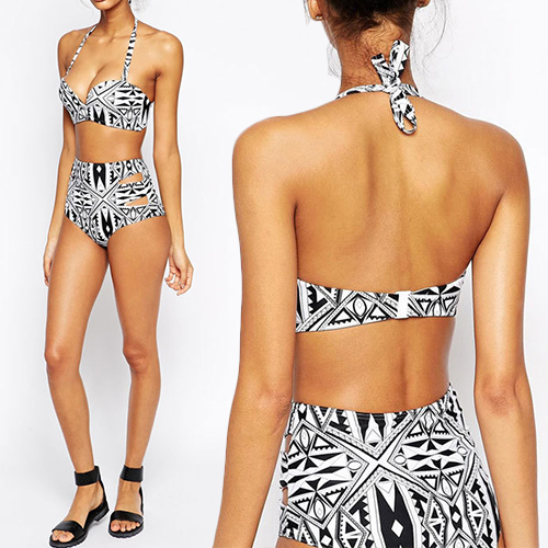 Features chic geometric print,stylish and eye-catching. Including a halter bra and a high waist briefs,