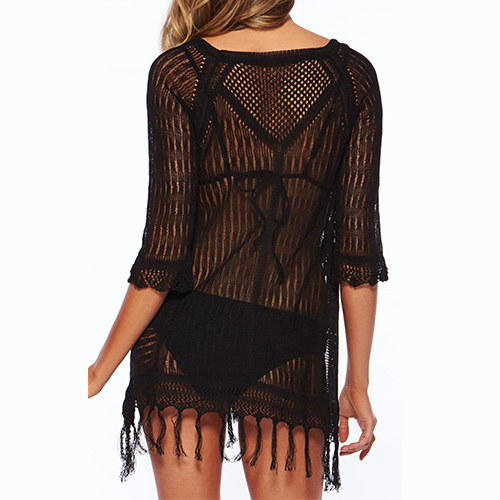 Sexy Half Sleeve Round Neck Tassel Hem Hollow Out Beach Smock