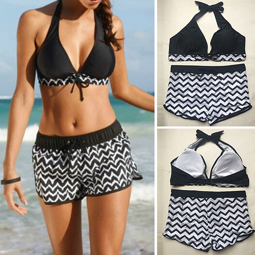 Wanna relax yourself? Then we suggest you heading to the seaside! This swimsuit set would be a good choice for you. Including a halter bikini top and a printed swimming shorts,this swimsuit set can give you a playful beach trip.