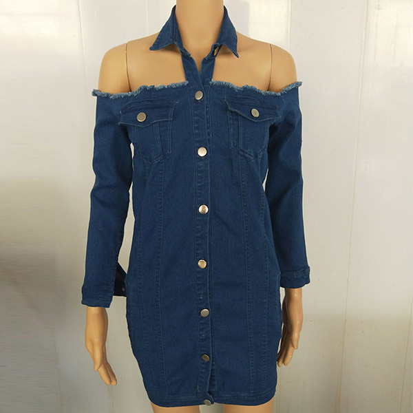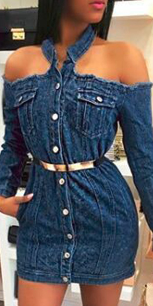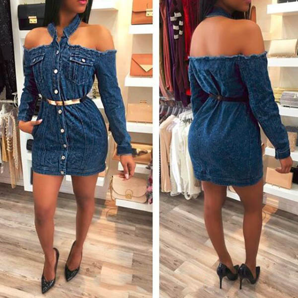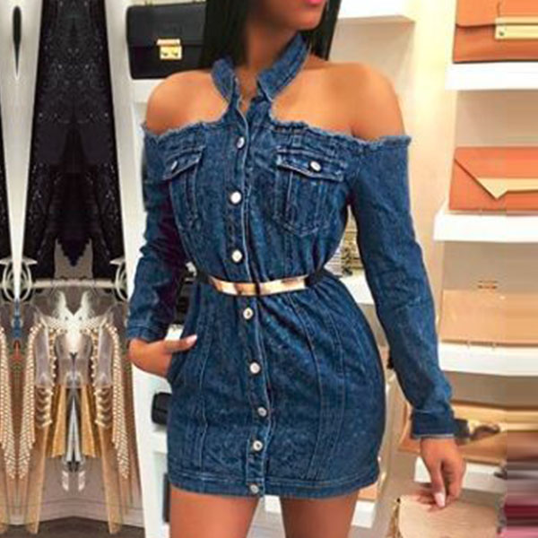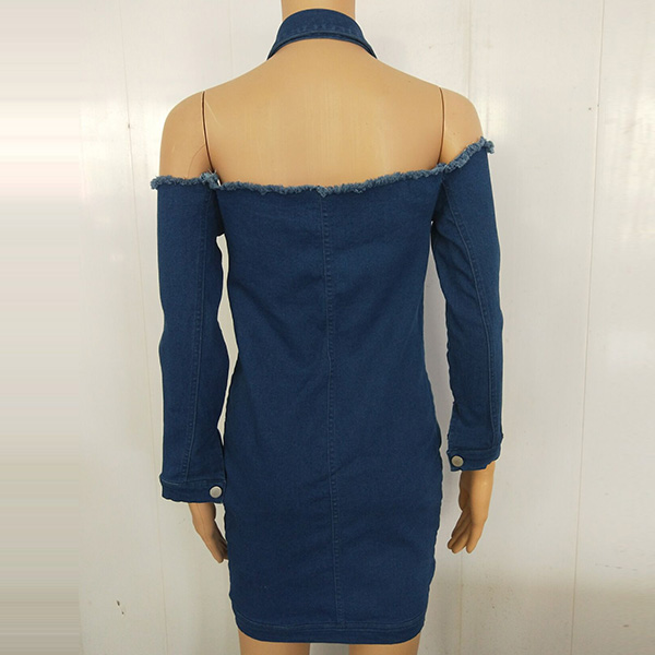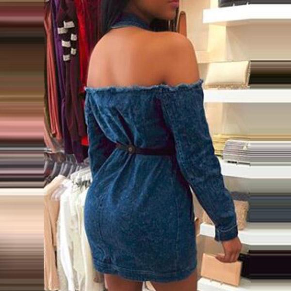 Sexy Halter Boat-neck Single-breasted Long Sleeve Denim Dress