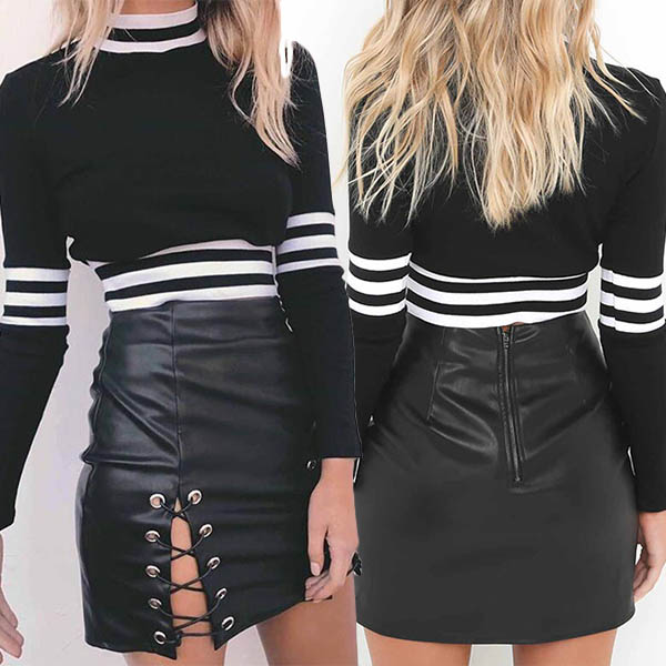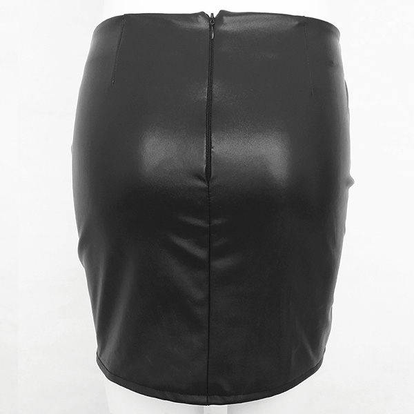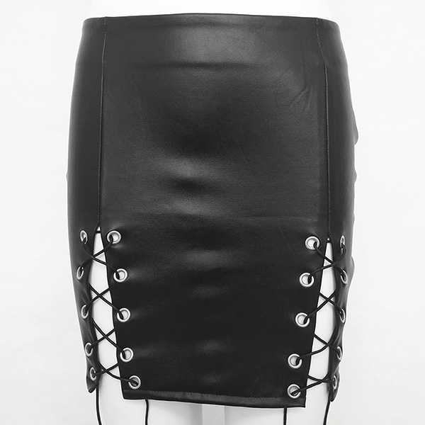 PU leather skirt. Solid color style,with high waist and lace-up slit hem,sexy and distinctive.