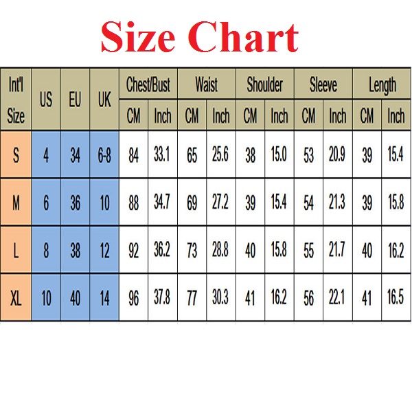 XL : Bust : 96cm(37.8"); Waist : 77cm(30.31"); Shoulder : 41cm(16.14"); Sleeve : 56cm(22.05"); Length : 42cm(16.54");