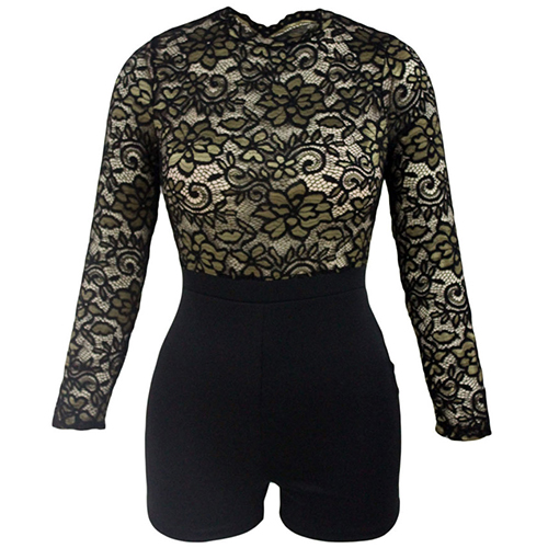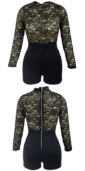 A perfect combination of flirty and alluring,this romper features long sleeve,fit silhouette and hollow out lace spliced