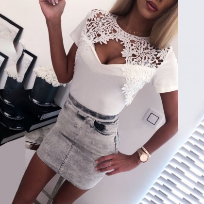 As for a cozy yet sexy style,you can just slip into this t-shirt. The hollow out lace spliced design is the highlight,