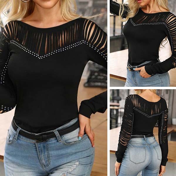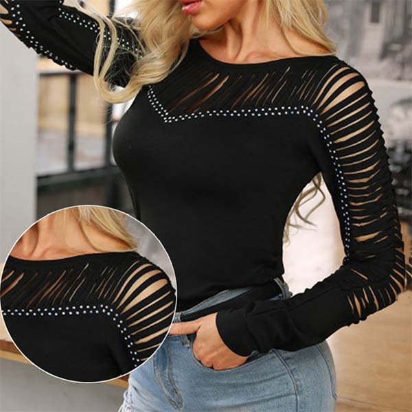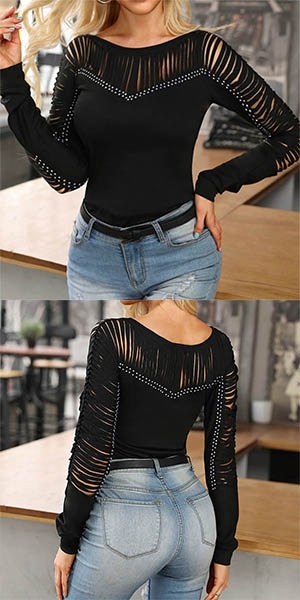 You can easily arouse more attention when you slip into this chic and sexy t-shirt. Comes with a classic yet flattering black,the hollow out and rhinestone details are the highlights,which make this piece different from others. Attracted? Then invite it to your wardrobe!