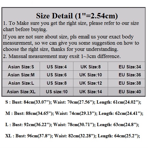 XL : Bust : 96cm(37.8"); Waist : 82cm(32.28"); Length : 64cm(25.2");