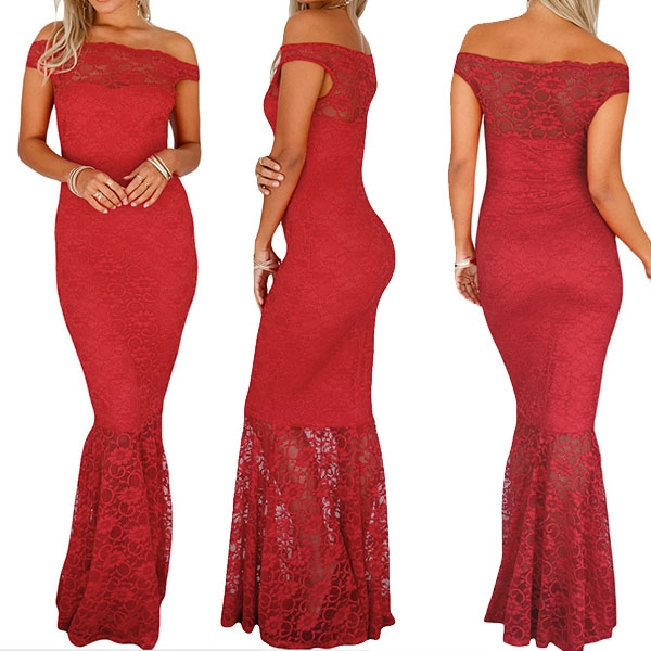 Going with some stunning details such as off-shoulder boat neck,fishtail hem and lace spliced design,