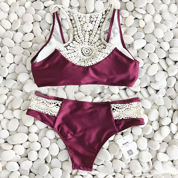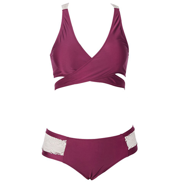 yourself? This bikini set with lace spliced and crossover design is your best choice for your beach time.