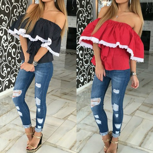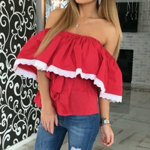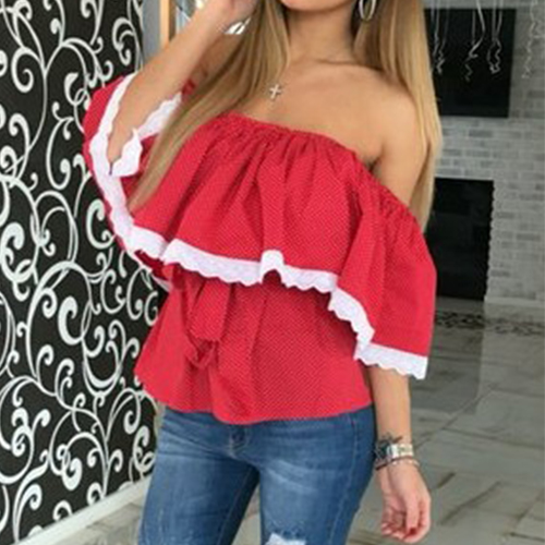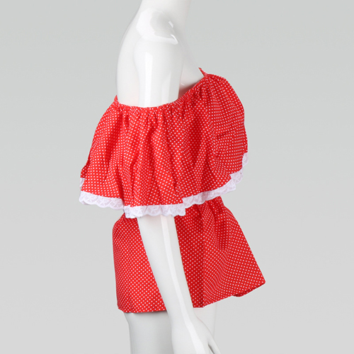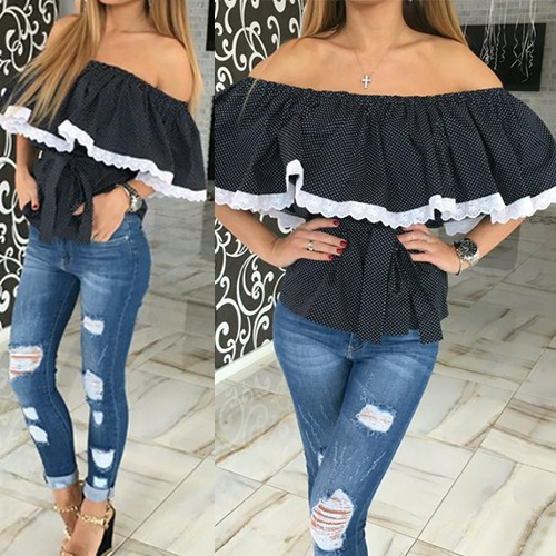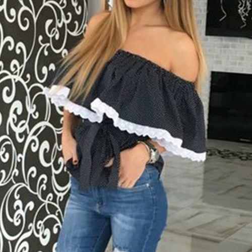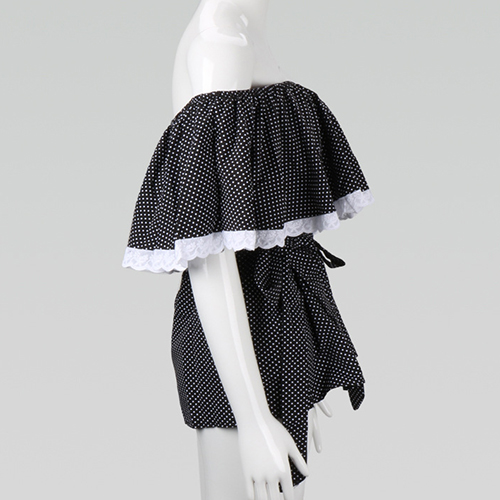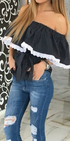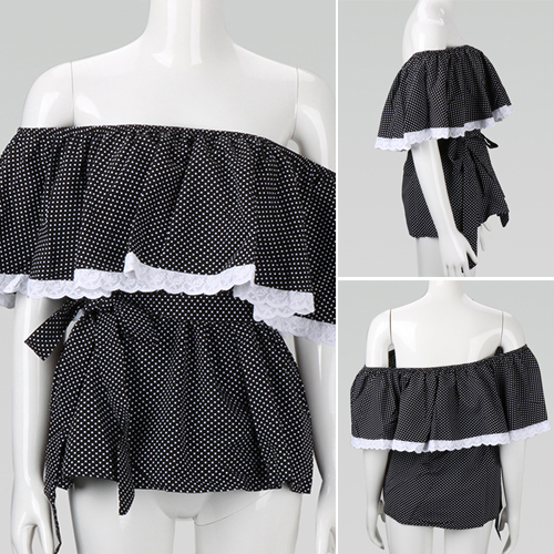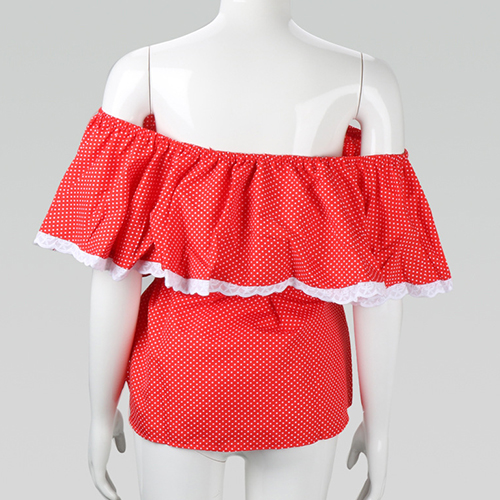 Dots printed style,its lace spliced flouncing and boat neck design makes this piece look so sexy and charming.