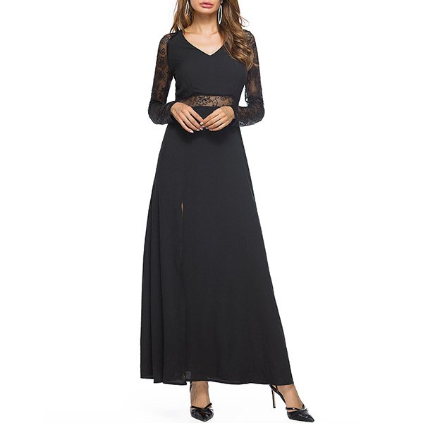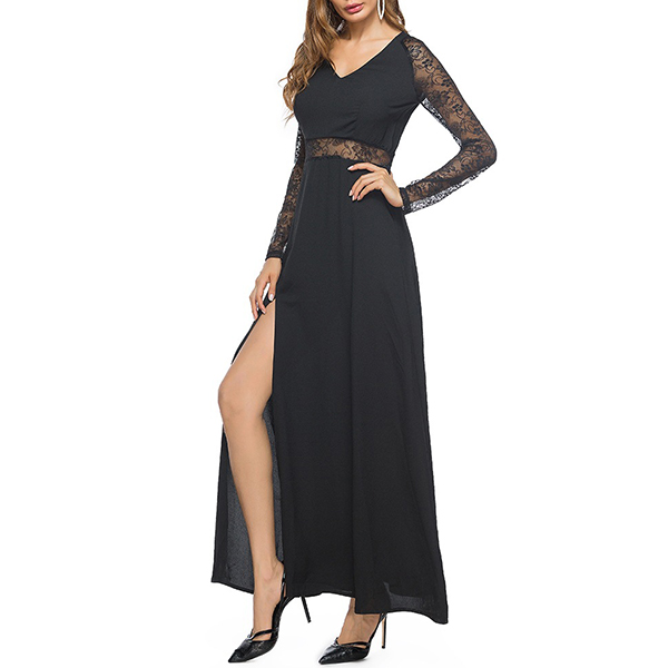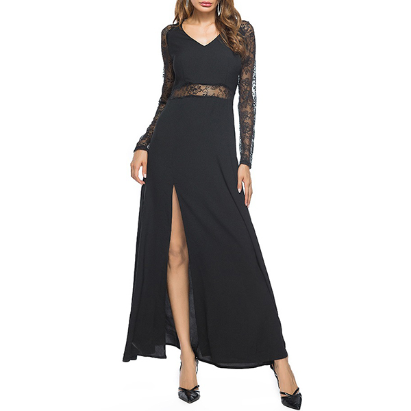 tone,the deep v-neck,slit hem and lace spliced design make this piece look so sexy and
