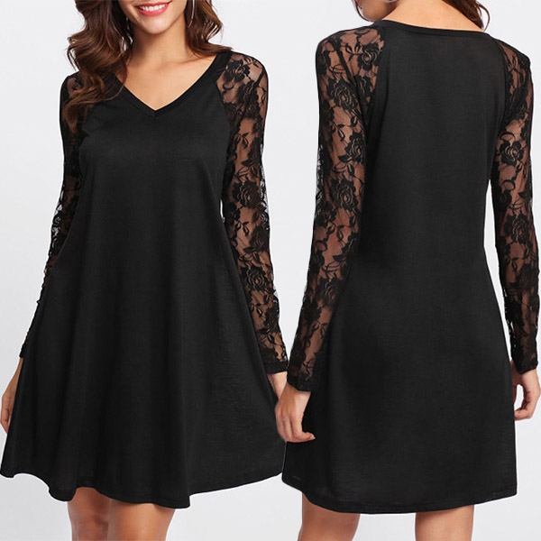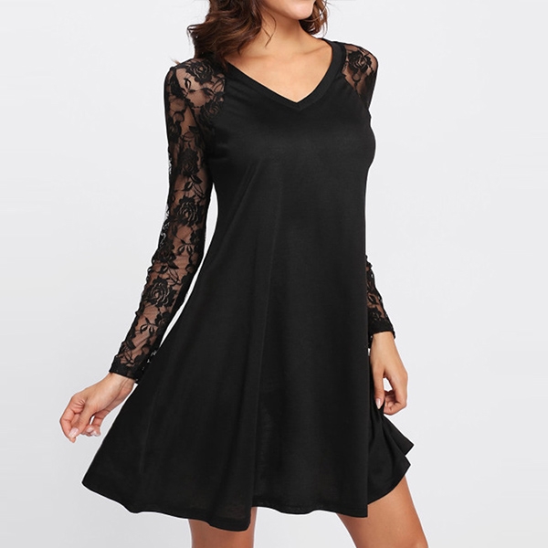 Boasting a classic yet flattering black tone,the lace spliced long sleeve and v-neck design can