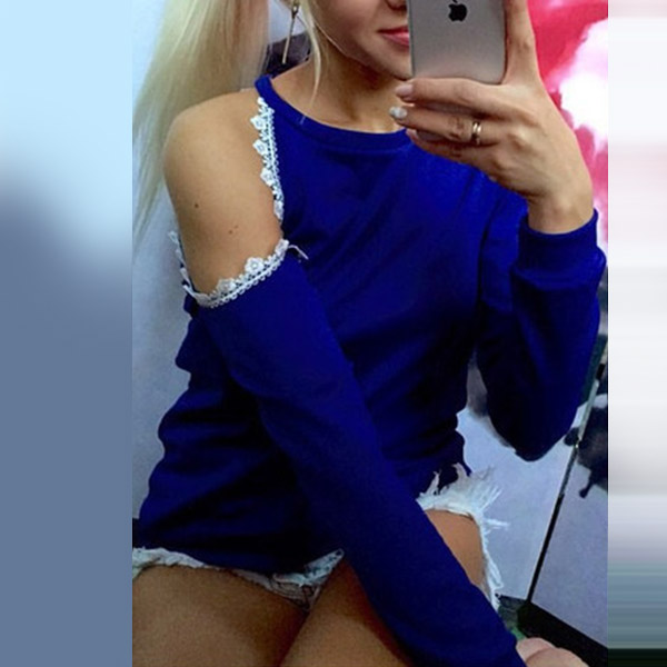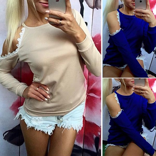 When it comes to a cozy yet feminine style,you can slip into this t-shirt. Solid color style,the off-shoulder