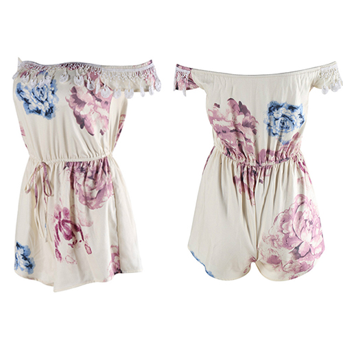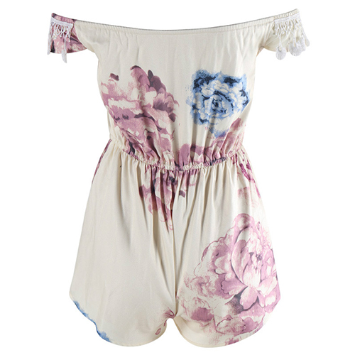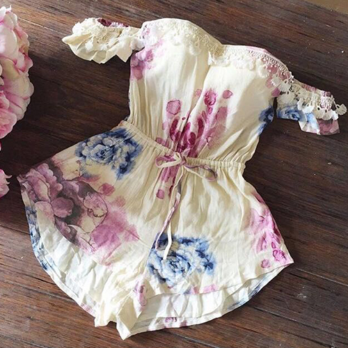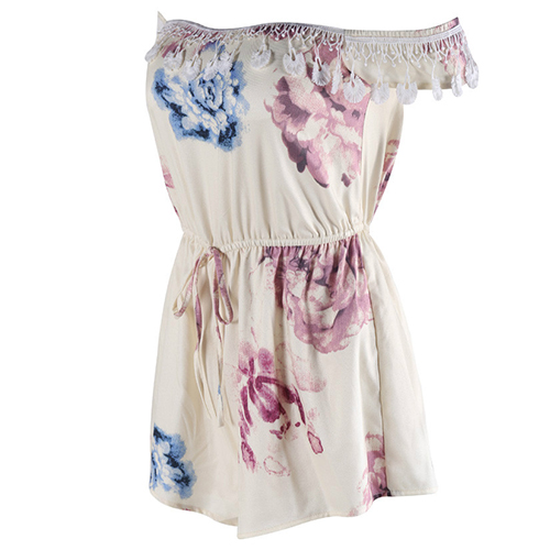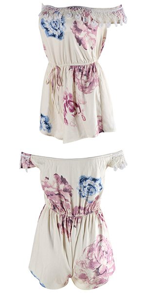 details such as lace spliced slash neck,elastic waist and chic printed pattern make this piece